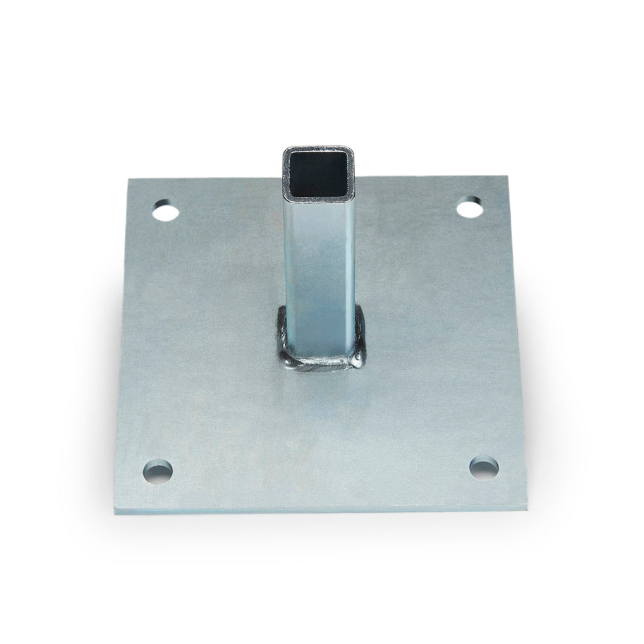 Our base support anchors to the floor through four precise, pre-drilled holes. It accepts a square tube column that is standard in many roller setups. The square-tube column fits snugly and securely with the steel base over a sturdy support that is welded tightly onto the strong, metal platform. Mounting fasteners are not included.