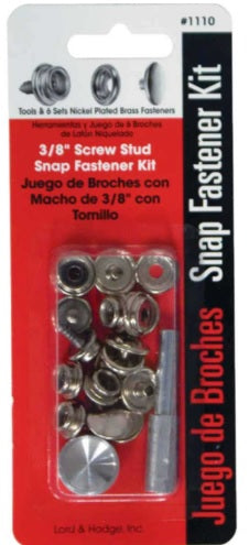 Each Metal Snap Fastener Kit contains six sets of nickel plated 3/8” screw stud snap fasteners, a flaring tool, and the setting base. This kit helps quickly and easily performs the task in replacing broken or missing snap fasteners in tarps, covers, shoes, clothes, curtains, bags, and many other items. The studs are provided for clamping on to the tarp material or other fabric in addition to screw studs utilized for mounting on hard surfaces. The six nickel plated snap fasteners include a stud, eyelet, button, and socket per set.